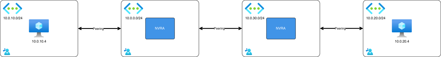 The test will be conducted in three stages to compare the throughput and latency when implementing the NVRA. The purpose is to see if there’s any degradation or how much degradation it is when NVRA is added to the traffic flow. First will be the baseline, just to get the measurements from two virtual networks directly peered with eachother, the second will have a NVRA as a hub between the two virtual networks, and the third will have two NVRA between the virtual networks to simulate moving between two hubs. Due to limits in the public preview all resources will be deployed in West Europe region, but that’s fine. Because the goal is to see what effect the NVRA has on the network.