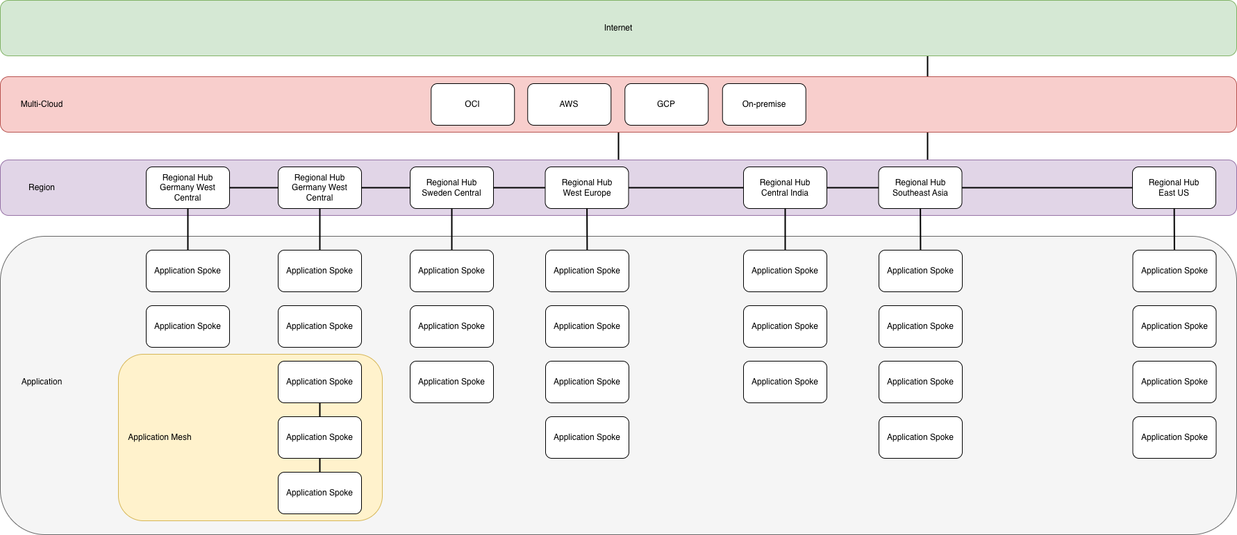 Applications are connected to the regional hub that is deployed in the same region as the application, in a hub-and-spoke pattern. All traffic that leaves the application is sent to the regional hub to be routed to the destination. Application mesh isn’t needed since the regional hub is a high capacity, high throughput router in the same region that adds minimal latency.